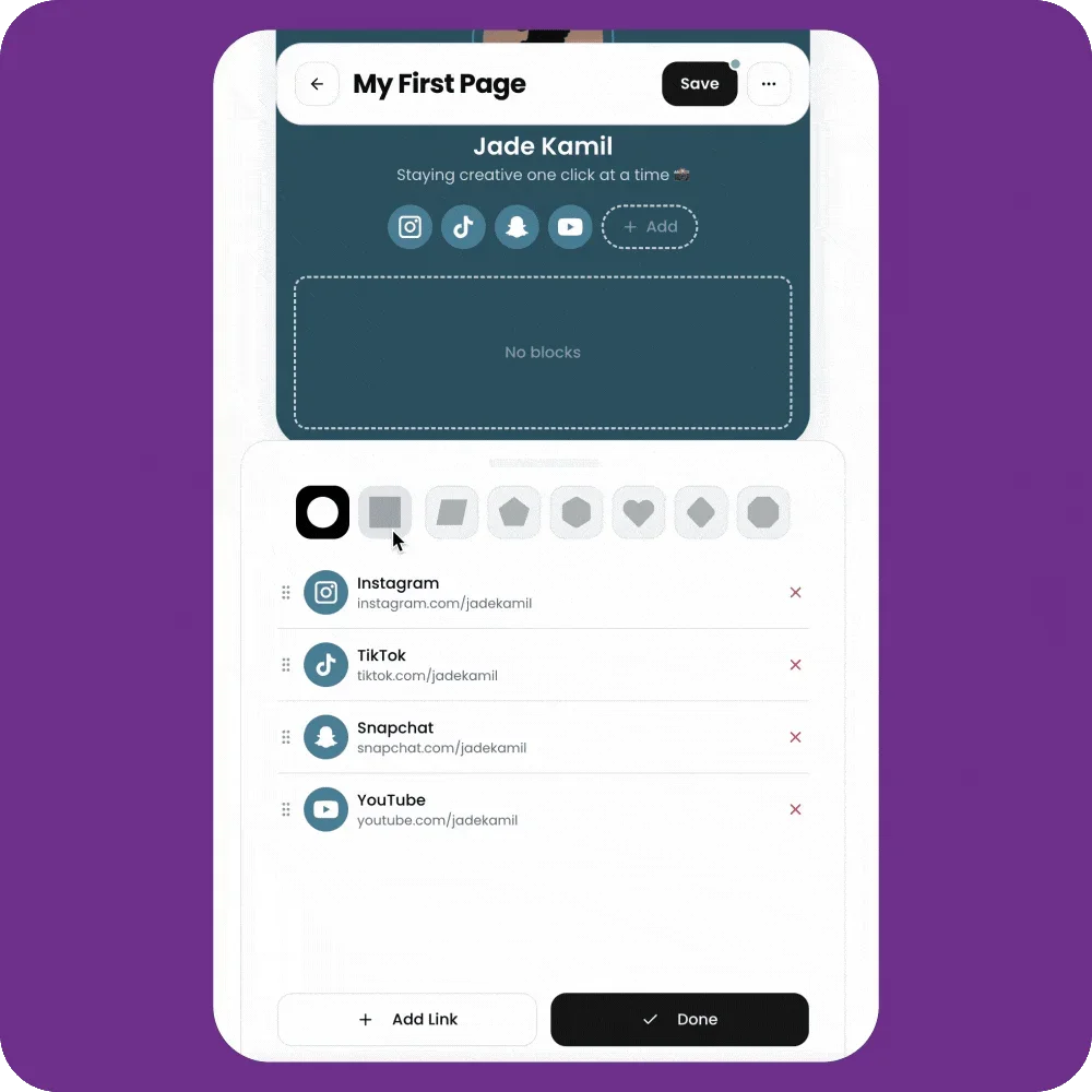 You can add icons for 50+ social platforms, reorder them, and customize their appearance to match your page.
