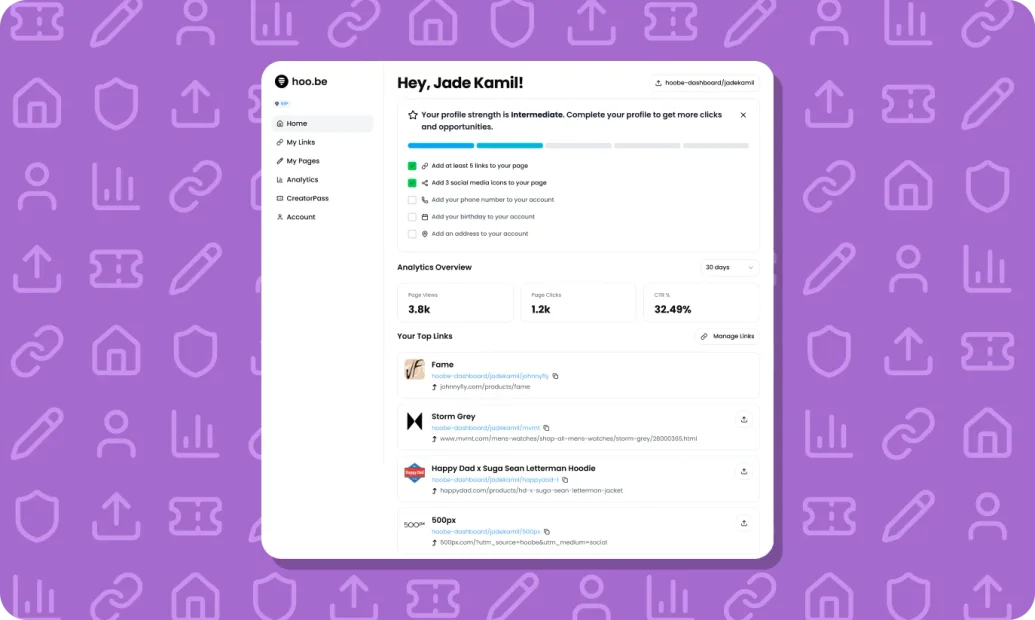 The Creator Home Page is your main dashboard for managing your hoo.be profile. It gives you a quick view of your performance, top links, and tools to update your page efficiently.